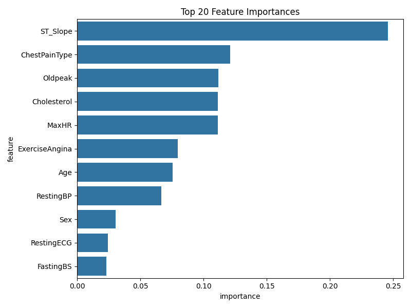 Variáveis mais relevantes: ST_Slope, ChestPainType, Oldpeak, Cholesterol, MaxHR