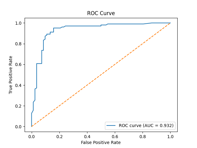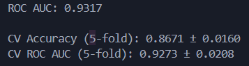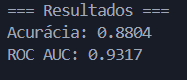 Desempenho: Accuracy = 0.88, ROC AUC = 0.93, CV AUC ≈ 0.93 ± 0.02