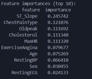 | Cholesterol e MaxHR (≈11% cada) | Colesterol sérico e frequência máxima atingida | Condiz com a fisiologia: colesterol elevado e menor capacidade cardíaca aumentam risco. |