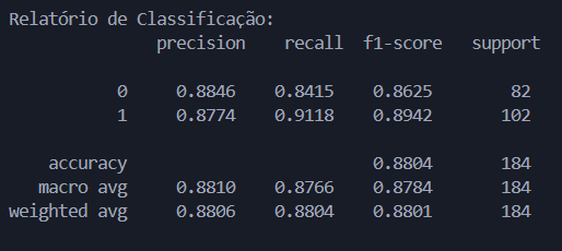 - A acurácia de 88,04% significa que o modelo acerta quase 9 em 10 previsões no conjunto teste.
